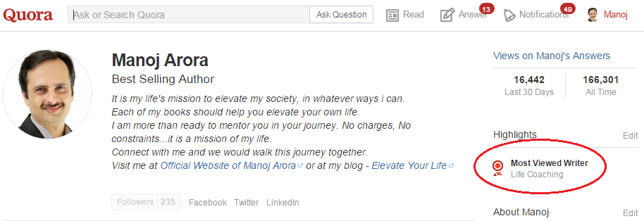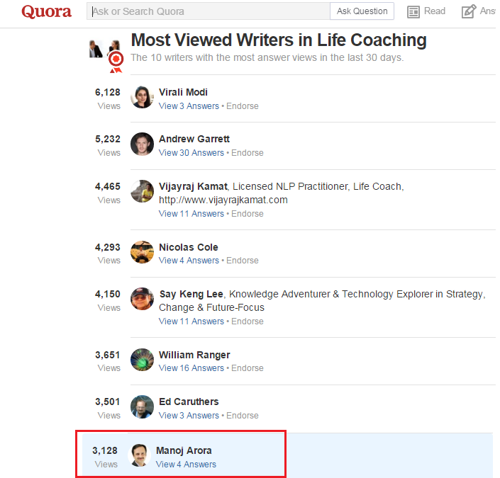 Most Viewed Writer on 'Life Coaching' Category Quora Full Screen | View Details | Visit Author at Quora |